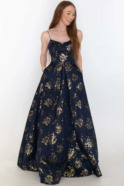 Nyla Navy Jacquard Gown by Bariano - RENTAL